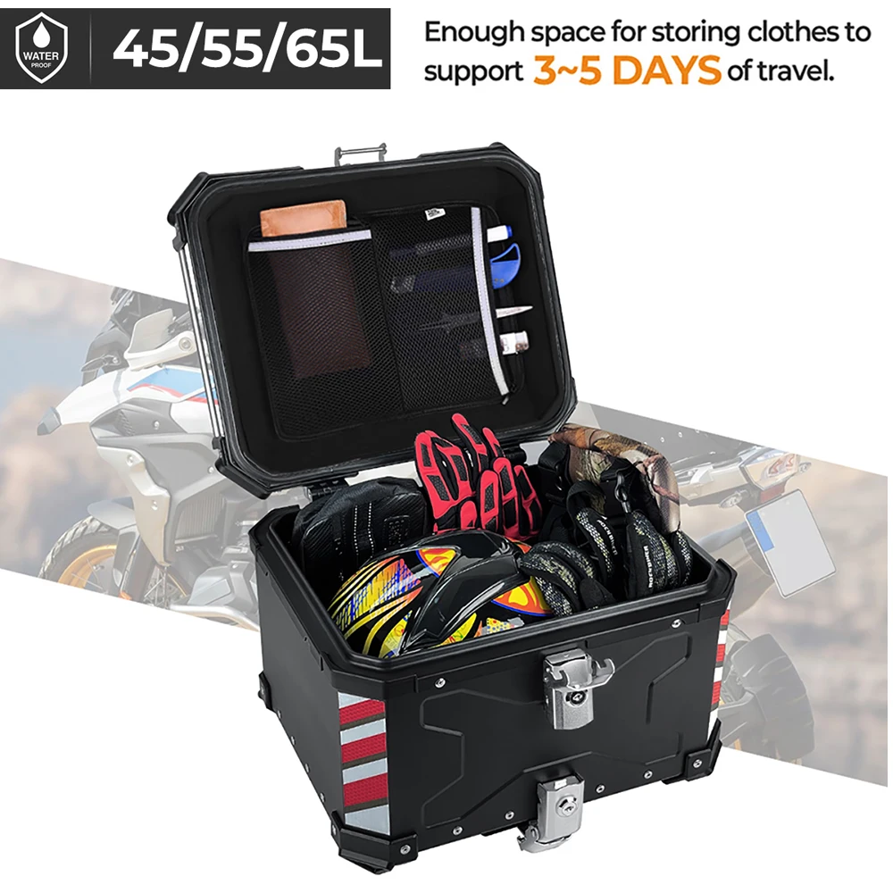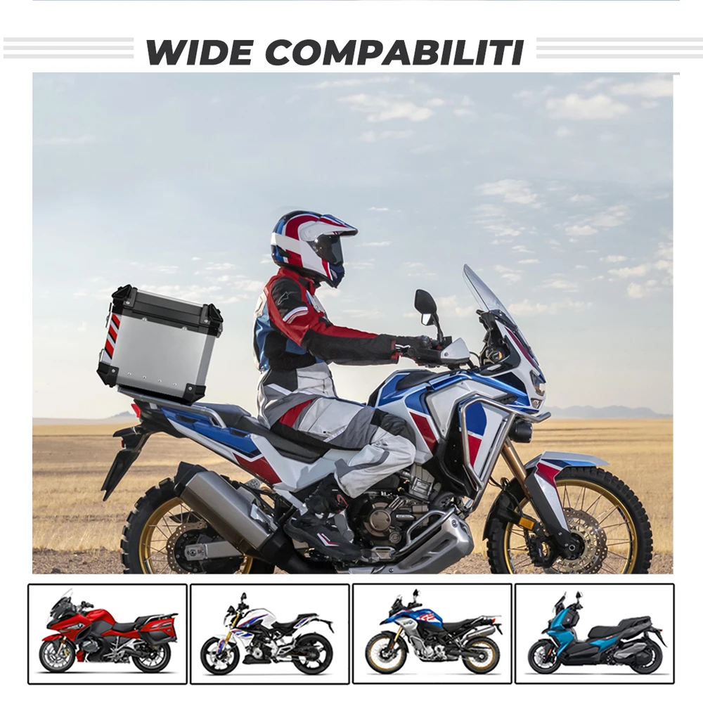 Product Name: دراجة نارية جذع سبائك الألومنيوم أعلى حالة السفر الأمتعة صندوق تخزين دراجة نارية ملحق تخزين مقاوم للماء المضادة للتصادم